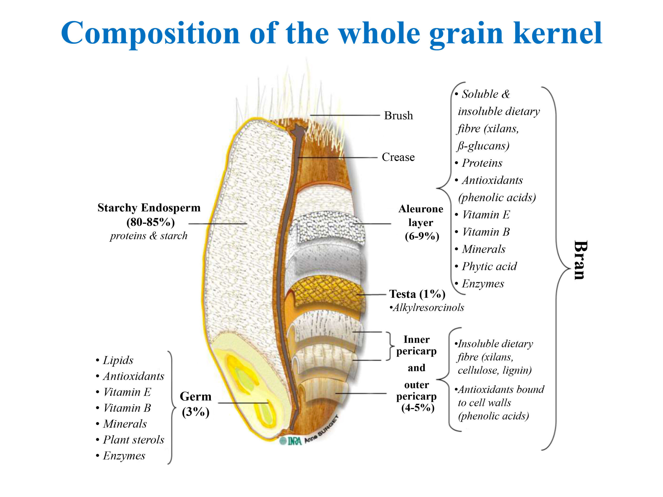 it depends on their structure and the type of cereal processing. Most whole wheat flours found on the market are recomposed flours. That is, a percentage of bran is added to one part of the starch (endosperm). With this operation, a part of the nutrients is thus lost and important parts of the caryopsis from a functional point of view are missing. In the illustration the external coverings, proceeding towards the inside, are: epicarp, mesocarp and endocarp. Together they form the pericarp, the protective organ. These coatings when ground will form bran.